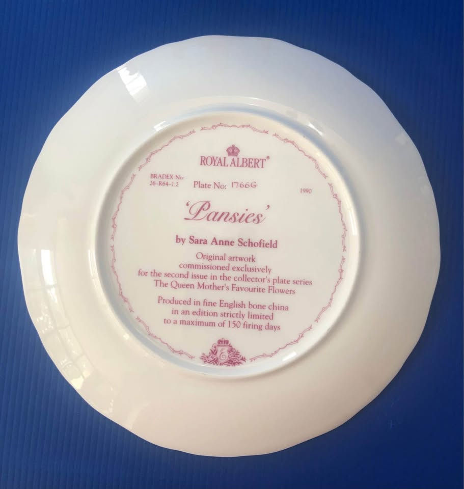 צלחת פורצלן של רויאל אלברט מסידרת The queen mother's favourite flowers על ידי המעצבת Sara Anne Schofield. שם הפרח אמנון ותמר בצבע סגלגל המסמל מחשבה , זיכרון או אהבה עדינה